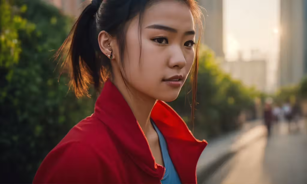 High resolution picture, free to use, a asian woman in a red jacket and a city street