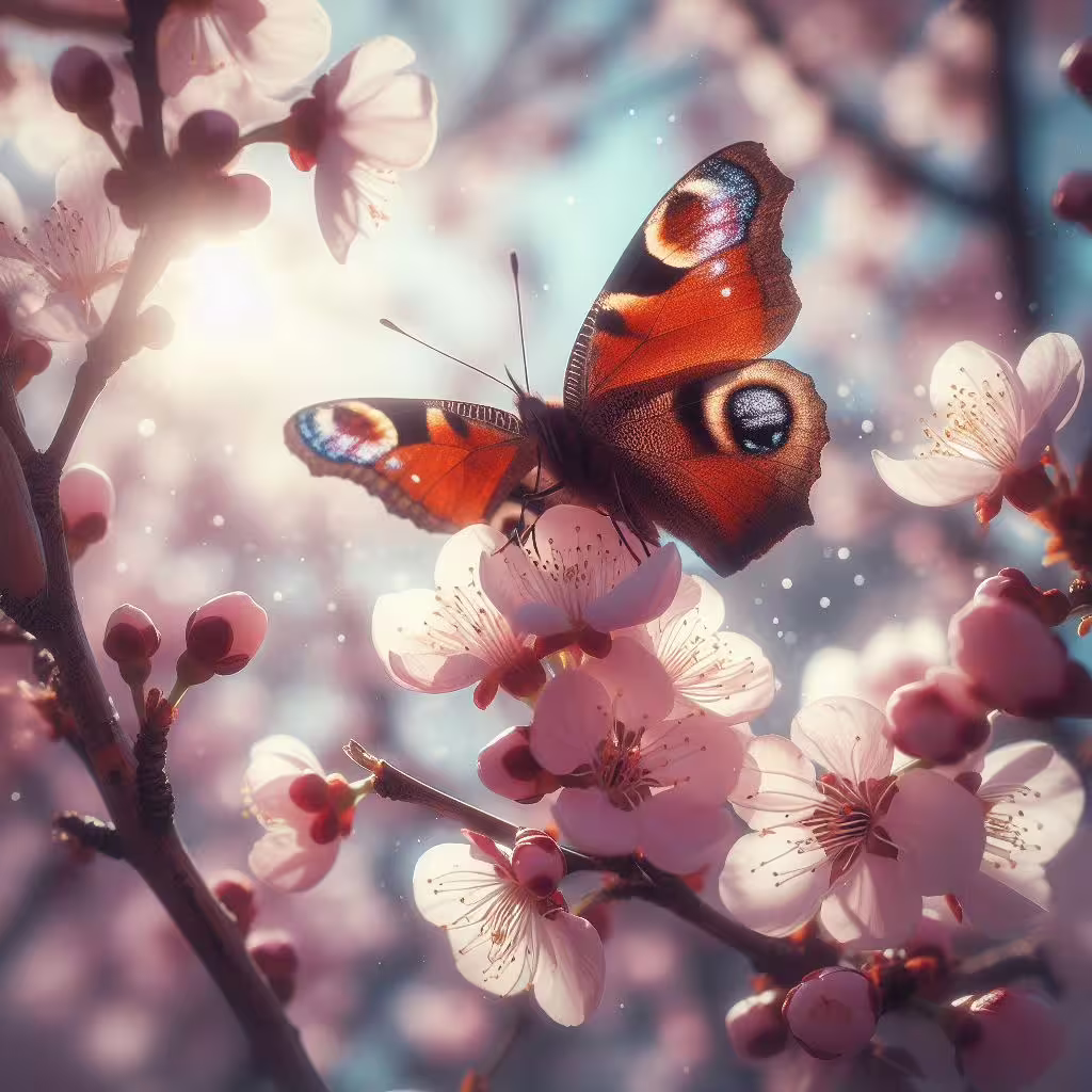 High resolution picture, free to use, a butterfly flying on a branch with flowers