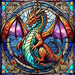 High resolution picture, free to use, a large, stained glass window with a dragon on it