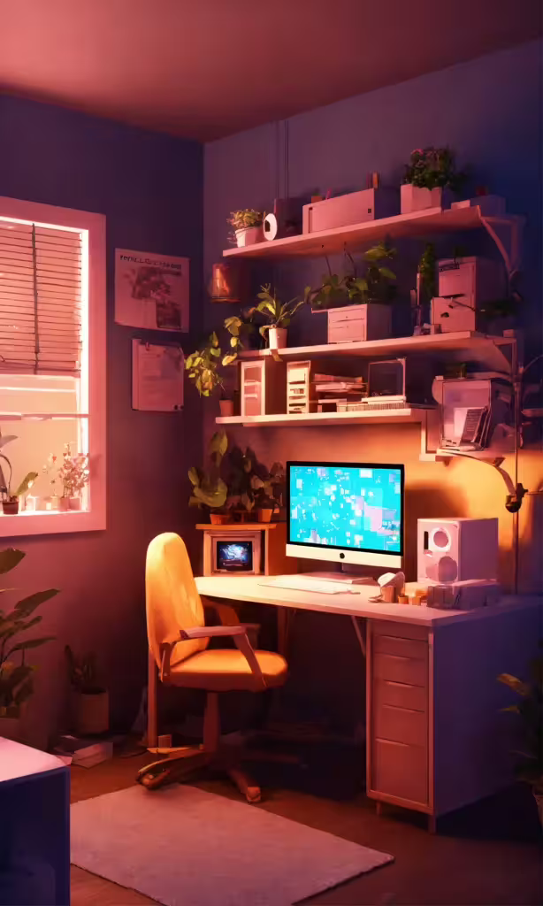 High resolution picture, free to use, a living area with a desk and shelf with computer equipment
