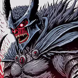 High resolution picture, free to use, a man in black with horns and red eyes wearing a horned mask