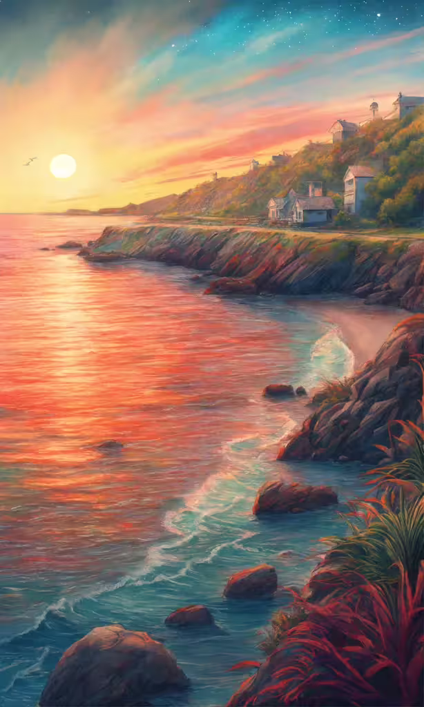 High resolution picture, free to use, a painting depicting the coast at sunset