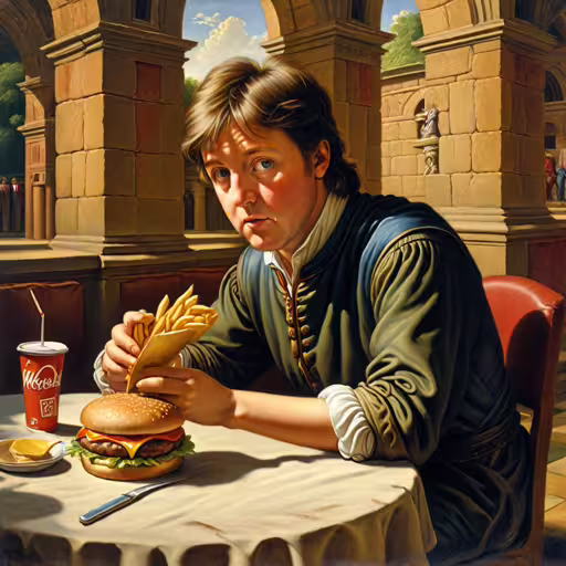 High resolution picture, free to use, a painting of a man eating a giant hamburger