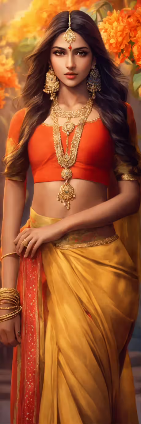 High resolution picture, free to use, a painting of a woman in an orange and yellow outfit