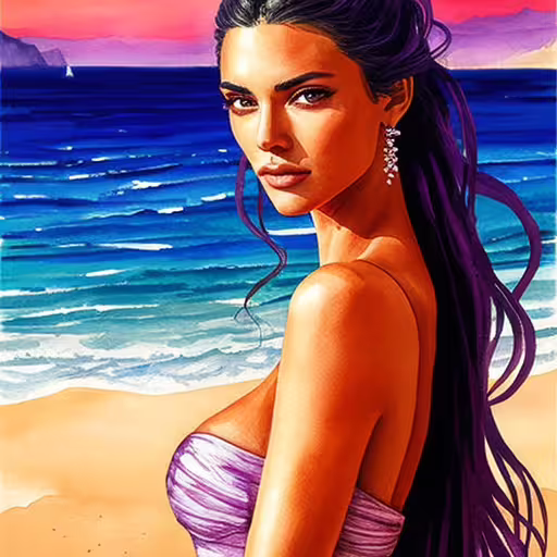 High resolution picture, free to use, a painting of a woman in purple dress on the beach