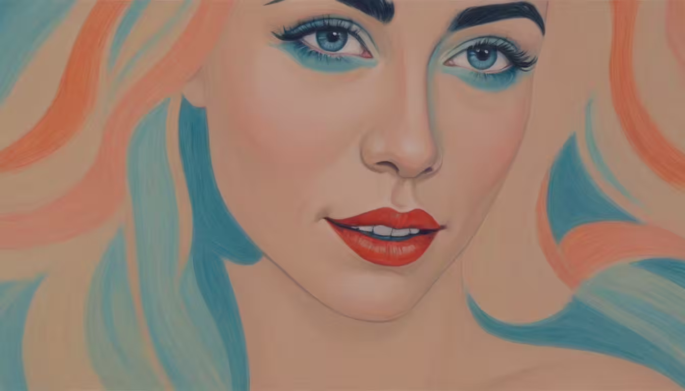 High resolution picture, free to use, a painting of a woman with red lipstick and blue hair