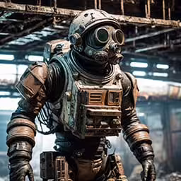 High resolution picture, free to use, a person in a suit and gas mask walking through a warehouse