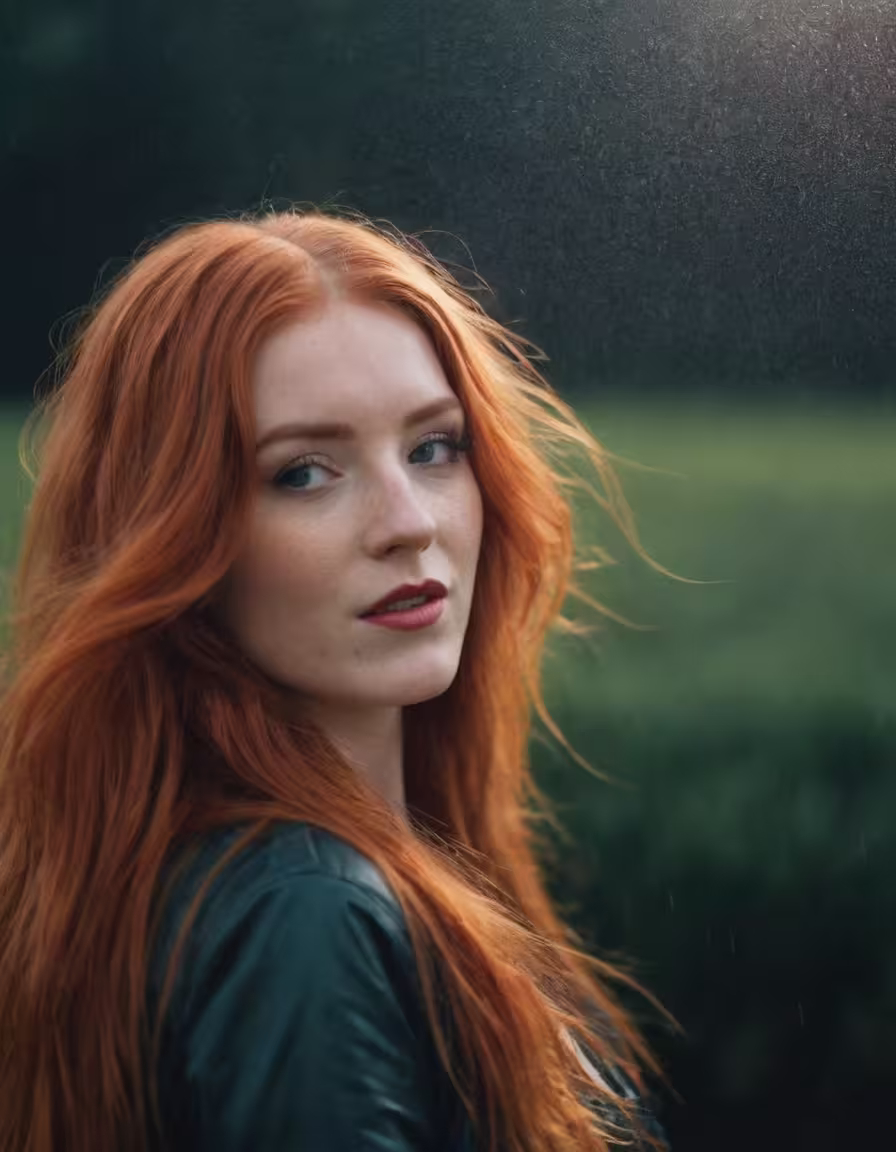 High resolution picture, free to use, a red headed woman with freckled hair stands in the rain
