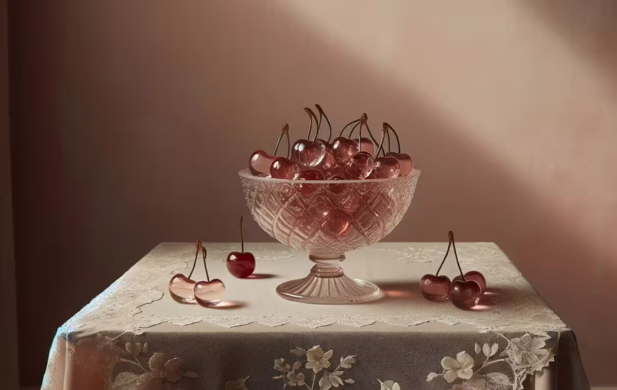 High resolution picture, free to use, a table with some cherries in a glass bowl