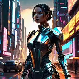 High resolution picture, free to use, a woman dressed in futuristic suit standing on a city street