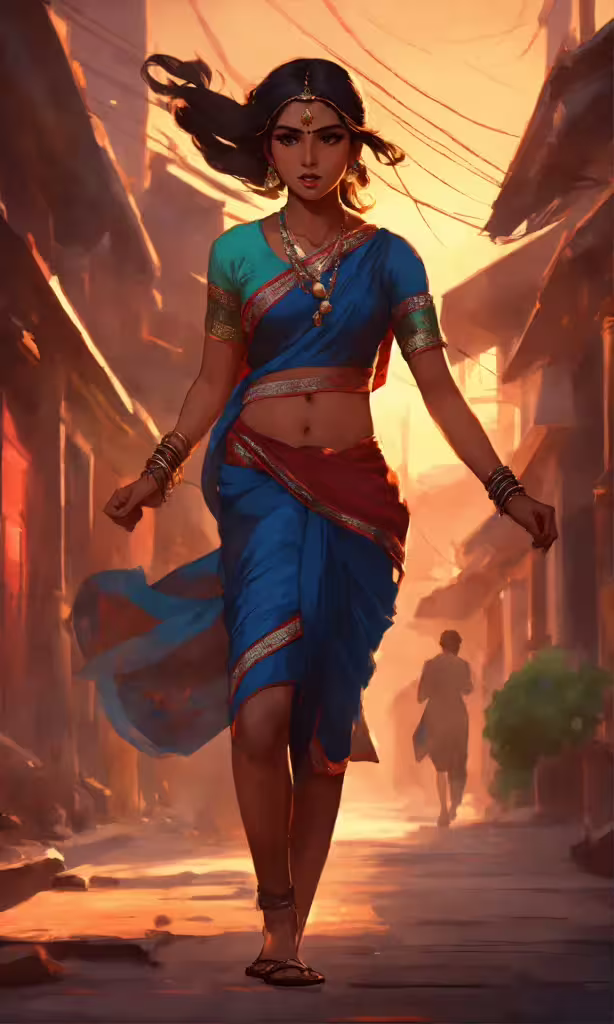 High resolution picture, free to use, a woman in a blue sari walking down a street