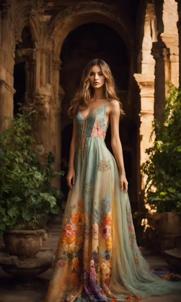 High resolution picture, free to use, a woman in a flowered dress standing by an arch