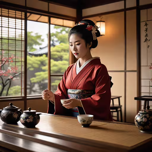 High resolution picture, free to use, a woman in a red dress and oriental hair stands by the table with asian pots and tea set