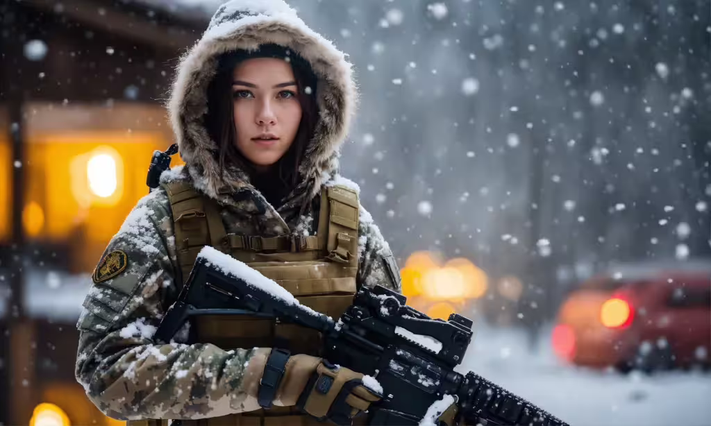 High resolution picture, free to use, a woman in military gear holding a gun