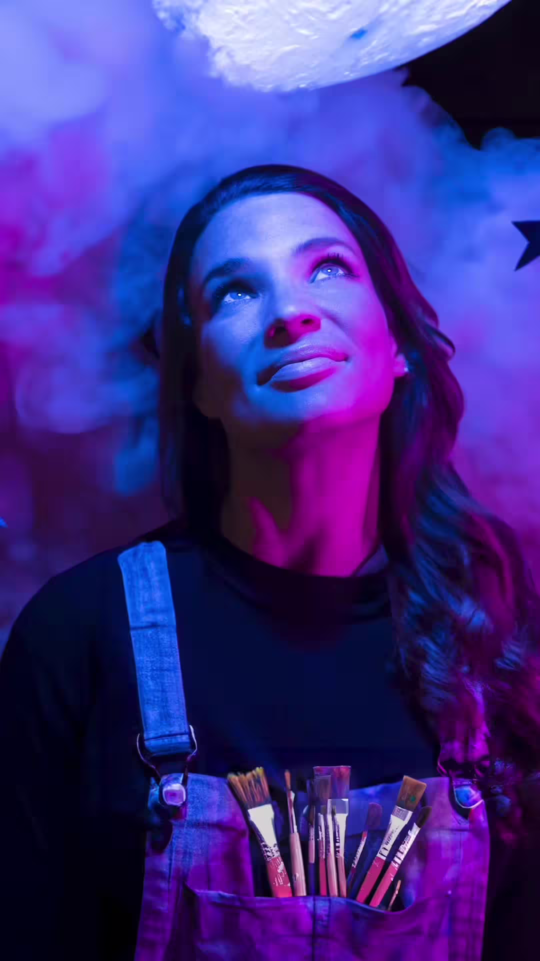 High resolution picture, free to use, a woman standing in front of a purple background with makeup brushes and brushes in her pocket