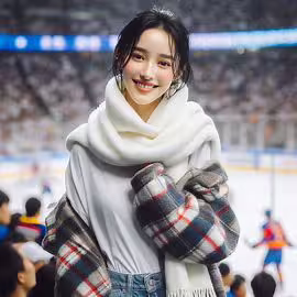 High resolution picture, free to use, a woman wearing a plaid blanket standing on a hockey rink