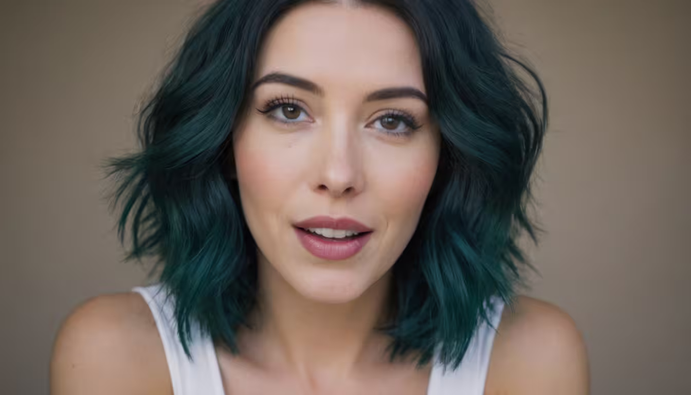 High resolution picture, free to use, a woman with dark hair and green bangs with a light brown background