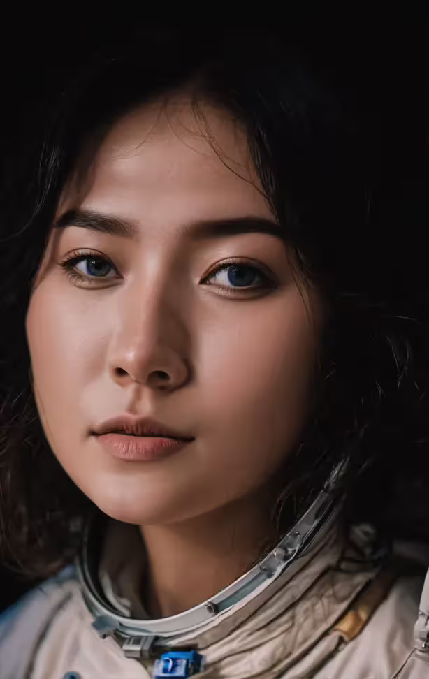 High resolution picture, free to use, a woman with dark hair wearing space equipment