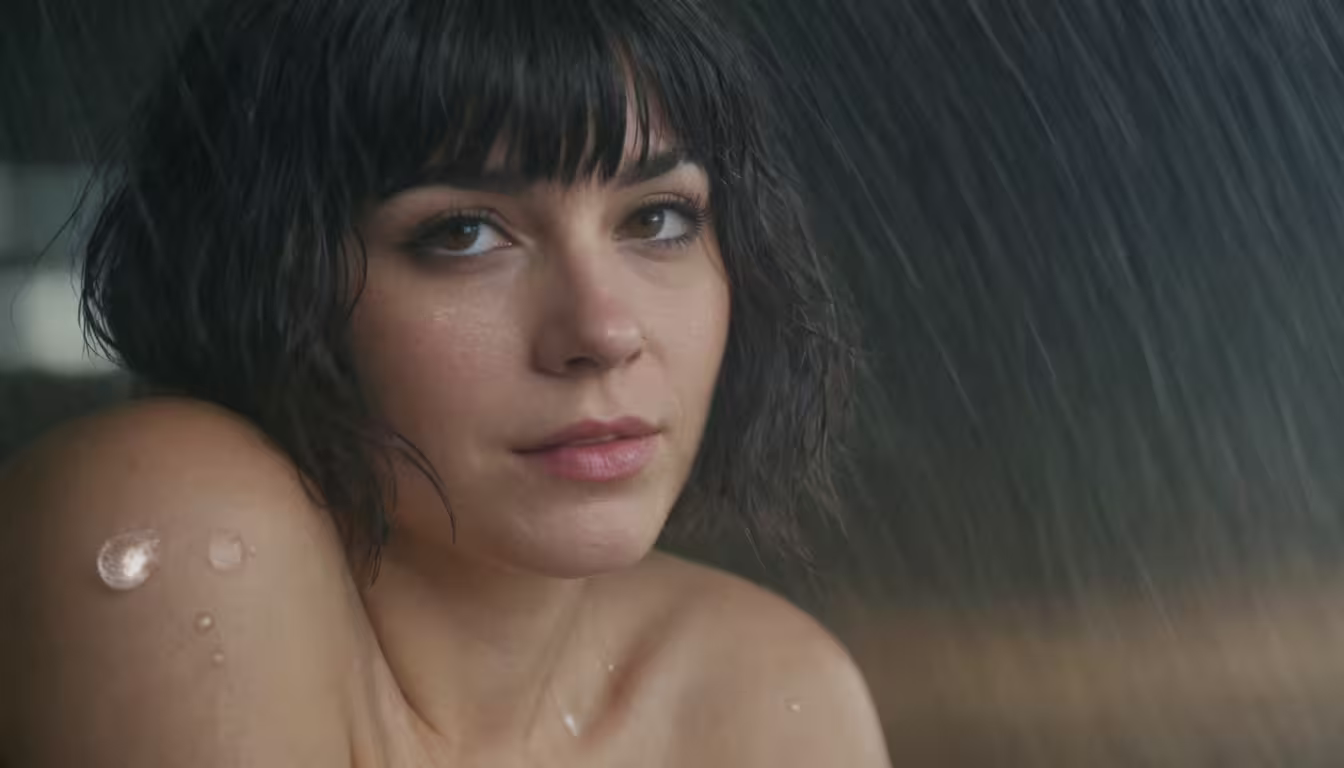 High resolution picture, free to use, a woman with frecky hair sitting in a shower