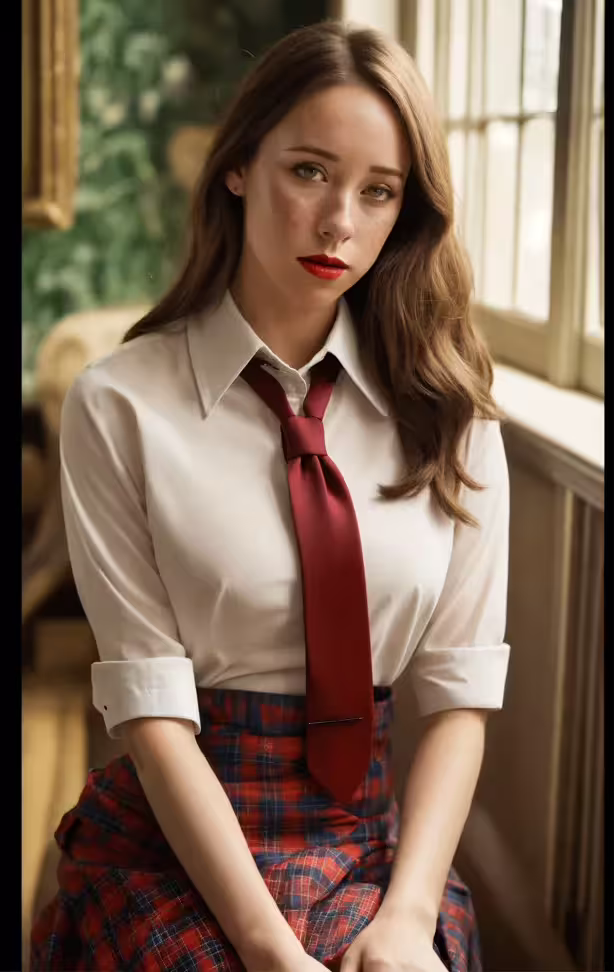 High resolution picture, free to use, a young girl wearing a skirt and shirt, and red lipstick