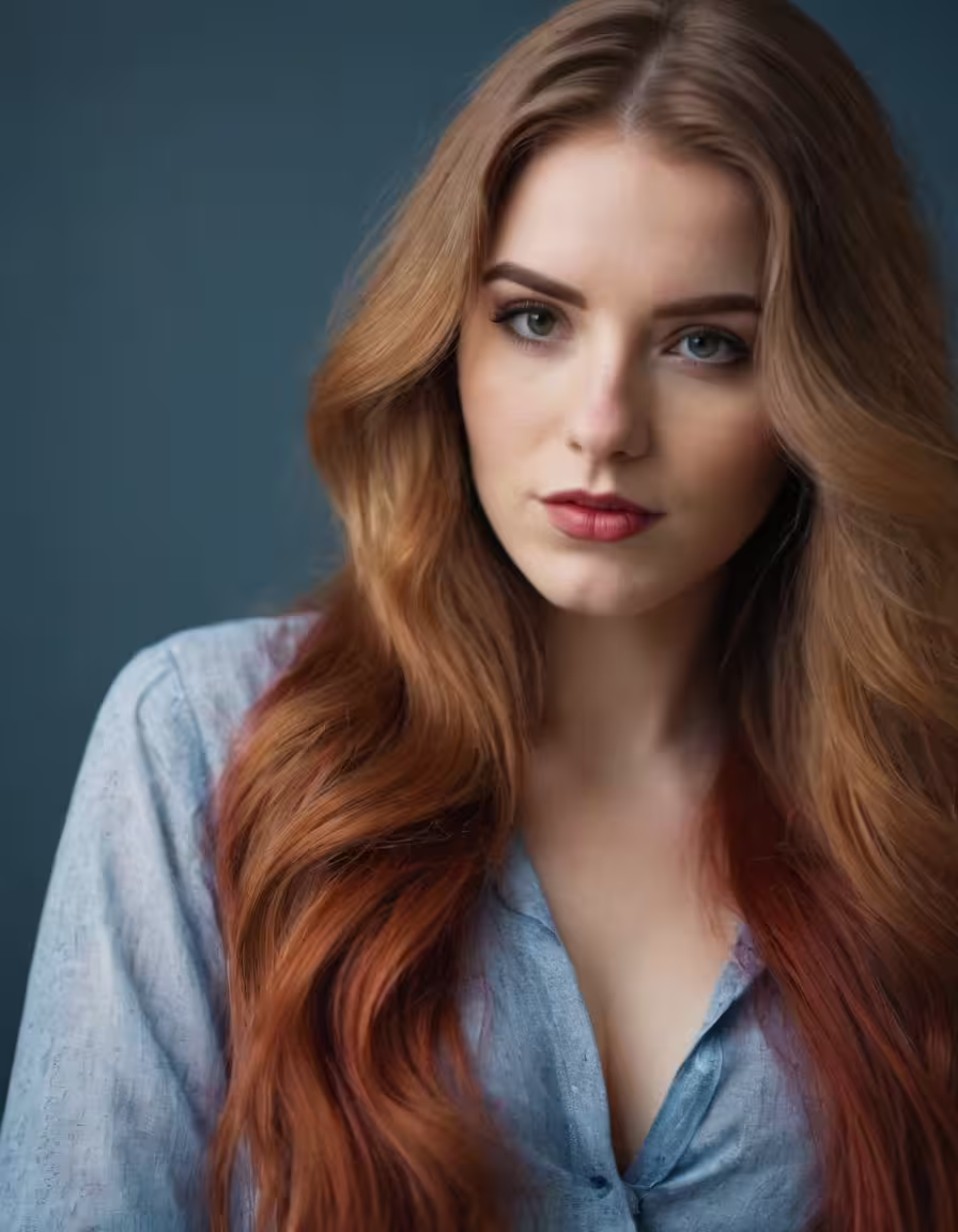 High resolution picture, free to use, a young woman with long red hair is posing for a portrait