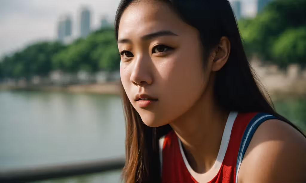 High resolution picture, free to use, an asian girl with a large nose sitting by the water