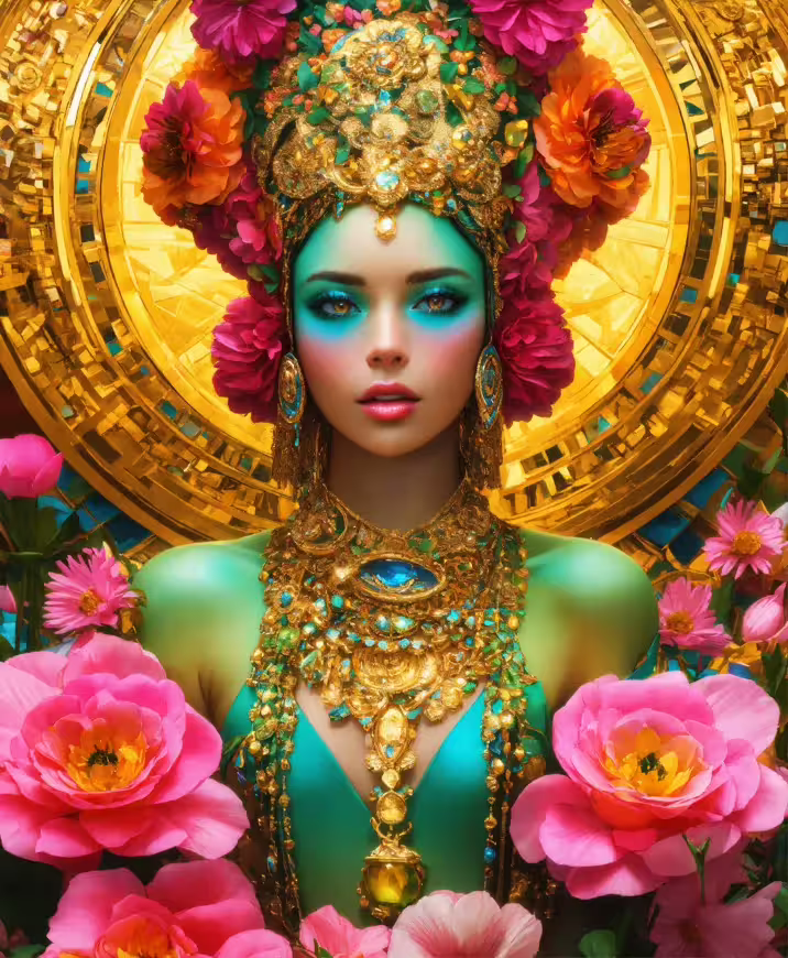 High resolution picture, free to use, an asian girl with flowers on her head and a golden plate