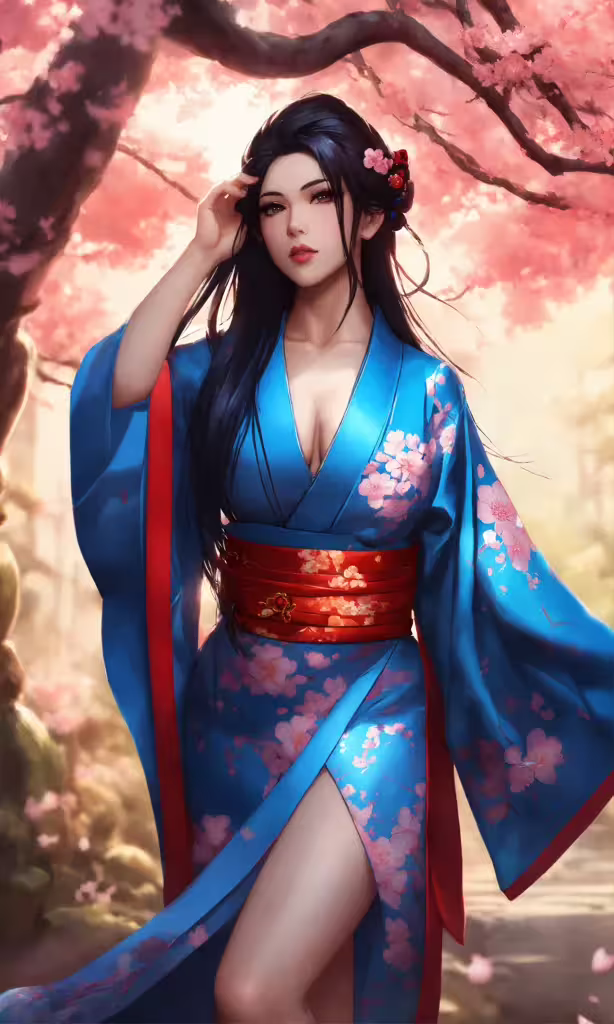 High resolution picture, free to use, an asian woman in a blue oriental dress with cherry blossoms