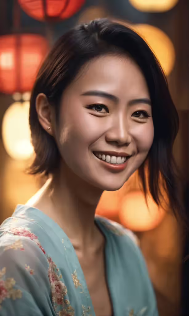 High resolution picture, free to use, an asian woman with dark hair smiling and wearing a blue top