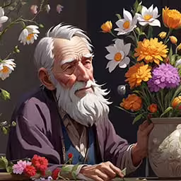 High resolution picture, free to use, an elderly man sitting behind a vase full of flowers