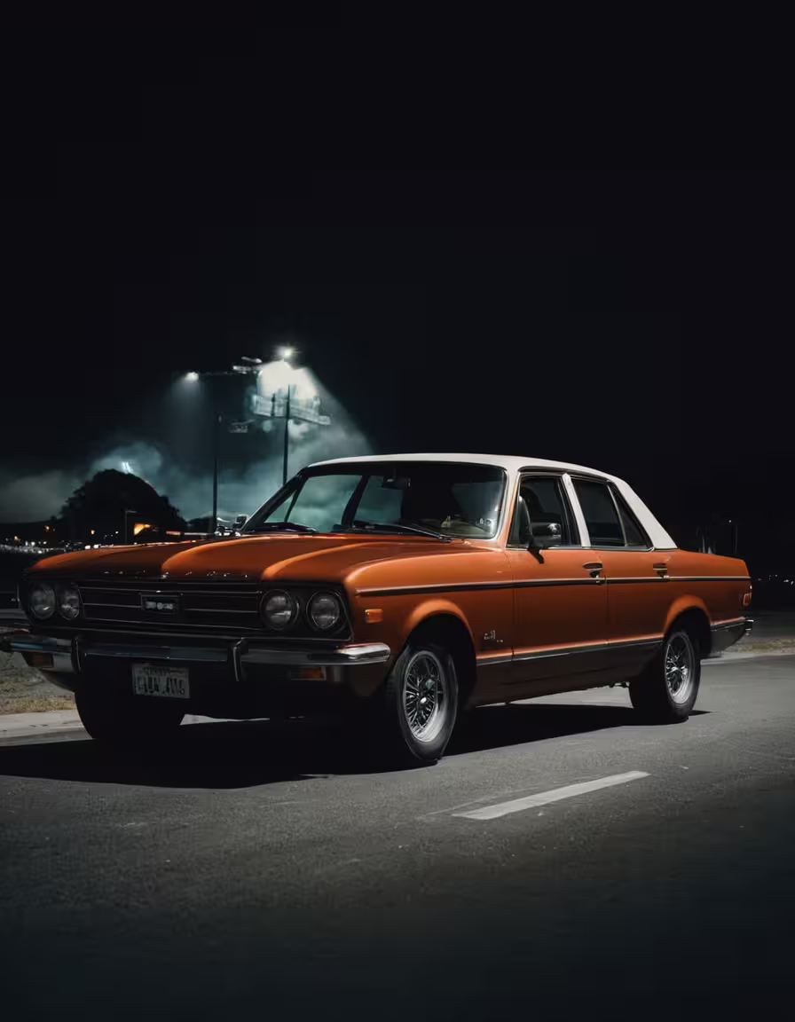 High resolution picture, free to use, an orange station wagon is parked on the side of the street at night