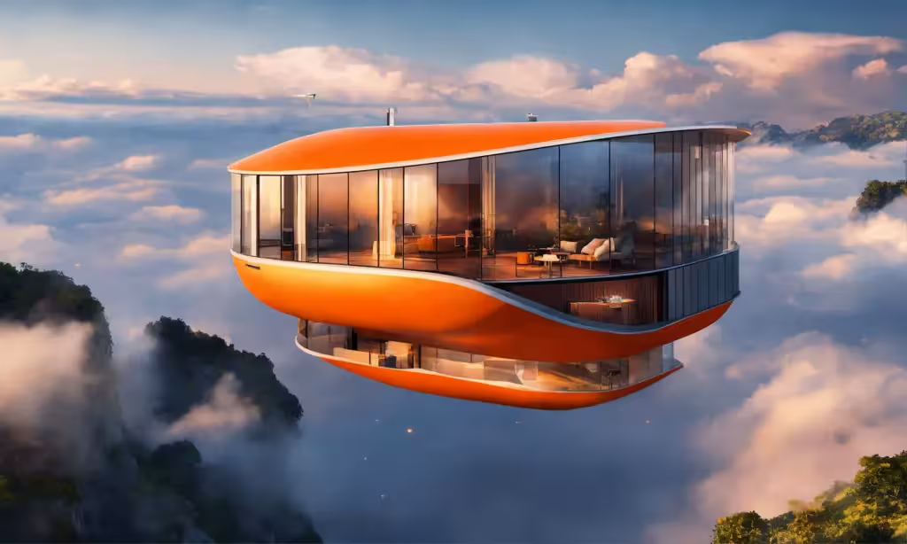 High resolution picture, free to use, an orange tower on a cliff above the clouds