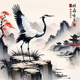 High resolution picture, free to use, an oriental painting with cranes and mountains