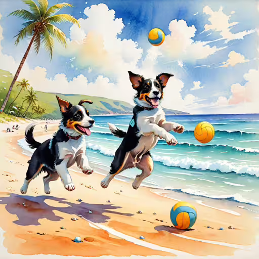High resolution picture, free to use, dogs jumping to catch beach balls on the shore of the ocean