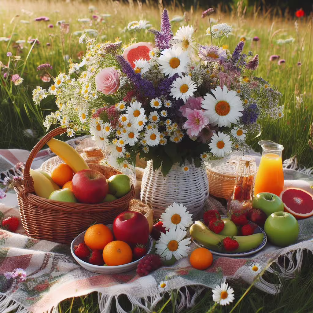 High resolution picture, free to use, the picnic is full of fresh fruit and flowers