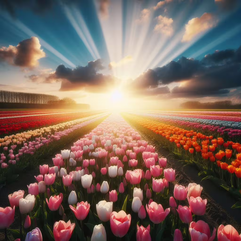 High resolution picture, free to use, the sun is setting over a field full of tulips