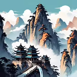 High resolution picture, free to use, this is an illustration of a mountainous asian landscape
