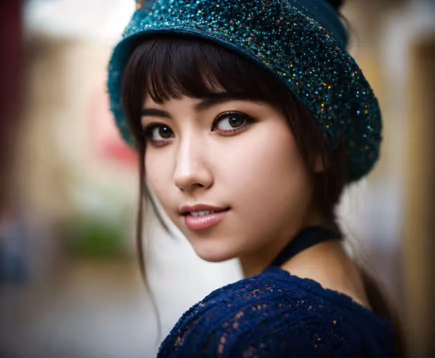 High resolution picture, free to use, young asian woman with blue top wearing a sparkling turquoise hat