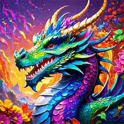 High resolution picture, free to use, a dragon with yellow eyes and large, colorful wings