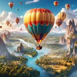 High resolution picture, free to use, a group of balloons flying over mountains and trees