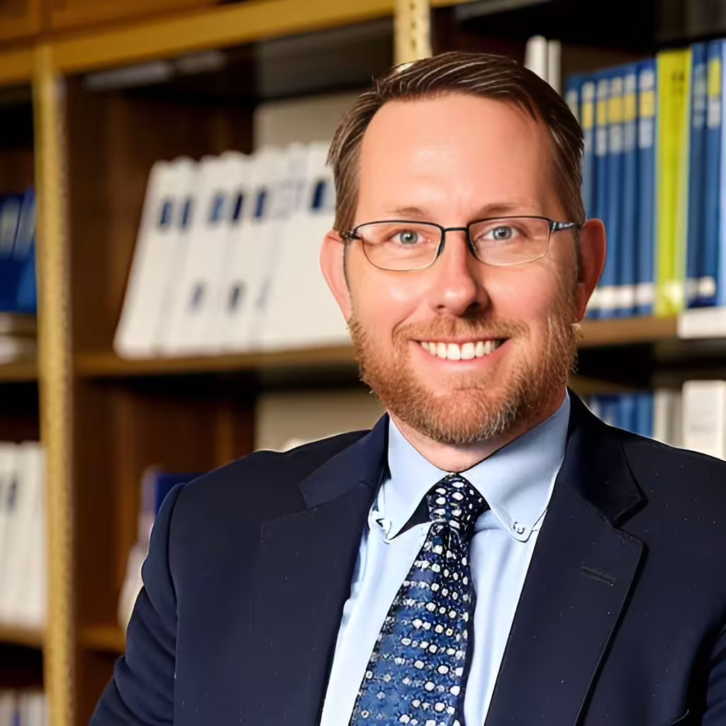 High resolution picture, free to use, a man in a suit standing in front of bookcases