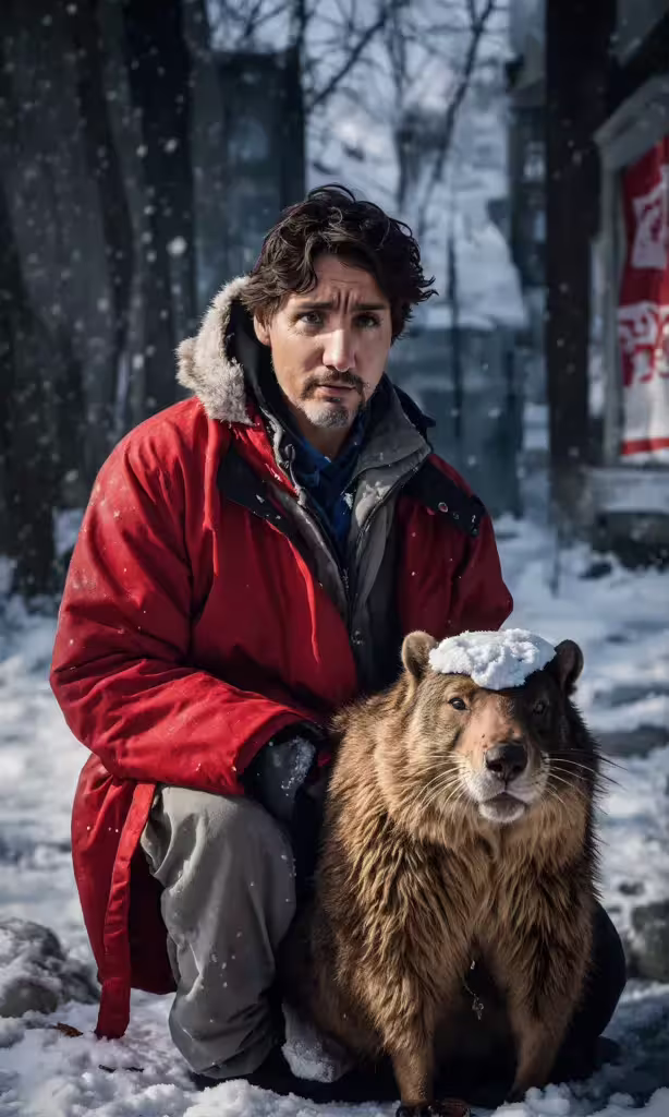 High resolution picture, free to use, a man squatting in the snow with a large brown bear