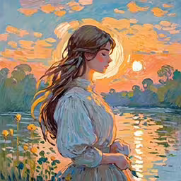 High resolution picture, free to use, a painting of a woman standing next to the water