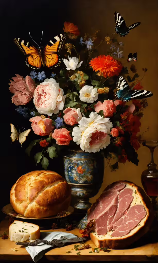 High resolution picture, free to use, a painting with flowers, a ham, bread and butterflies