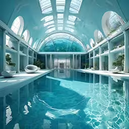 High resolution picture, free to use, a swimming pool inside of a large building with a large glass ceiling