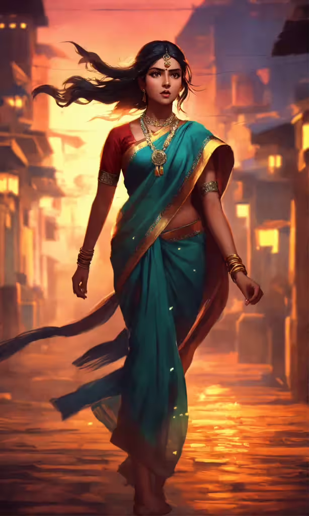 High resolution picture, free to use, a woman in a turquoise sari with long hair walking through a city