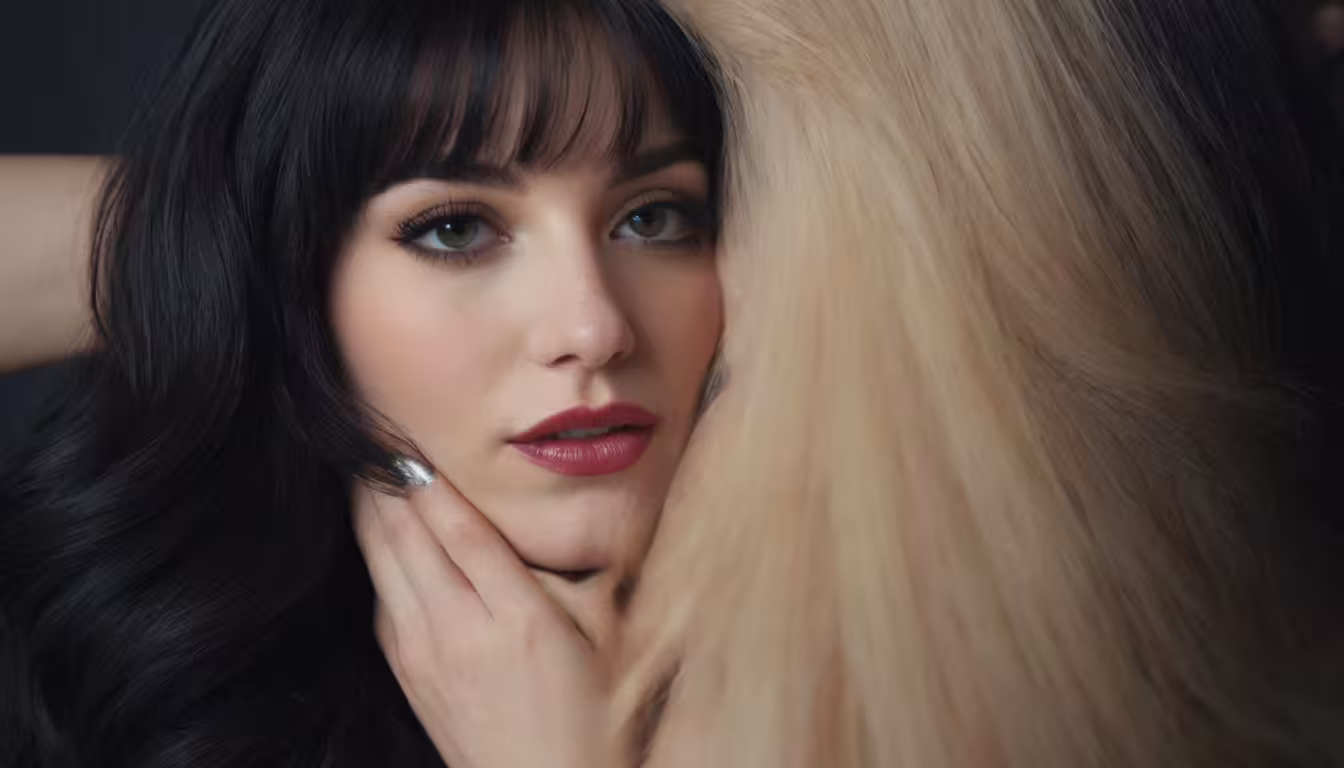 High resolution picture, free to use, a woman with a large blonde hair is photographed in front of a mirror