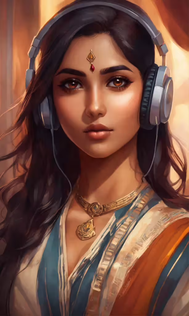 High resolution picture, free to use, a young woman wearing headphones while wearing an indian outfit