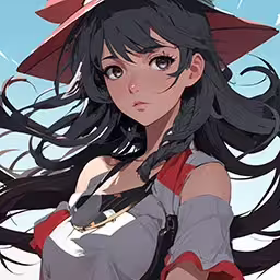 High resolution picture, free to use, an animated anime woman with long black hair wearing red and grey