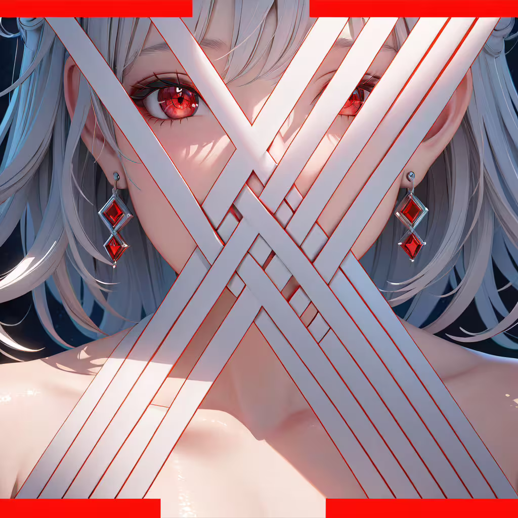 High resolution picture, free to use, an anime girl with long white hair, red eyes and grey hair with red cross straps
